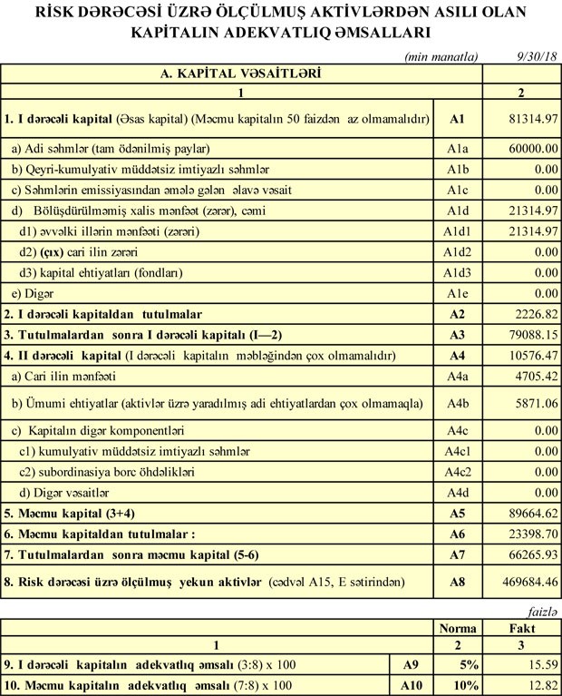 30 Sentyabr 2018-ci il tarixində ASB 66 milyon 265 min manat məcmu kapitala malik olub. Bank 31 Dekabr 2017-ci il tarixində 78 milyon 180 min manat məcmu kapitala malik idi. Məcmu kapitalın azalmasının səbəbi məcmu kapitaldan tutulmaların 5 milyon 790 min manatdan 23 milyon 399 min manata yüksəlməsidir.