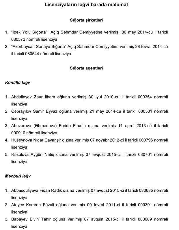 Sığorta fəaliyyətinə dair lisenziyaları ləğv olunmuş və yeni lisenziyalar almış sığorta şirkətlərinin və sığorta agentlərin siyahısı təqdim olunur.
