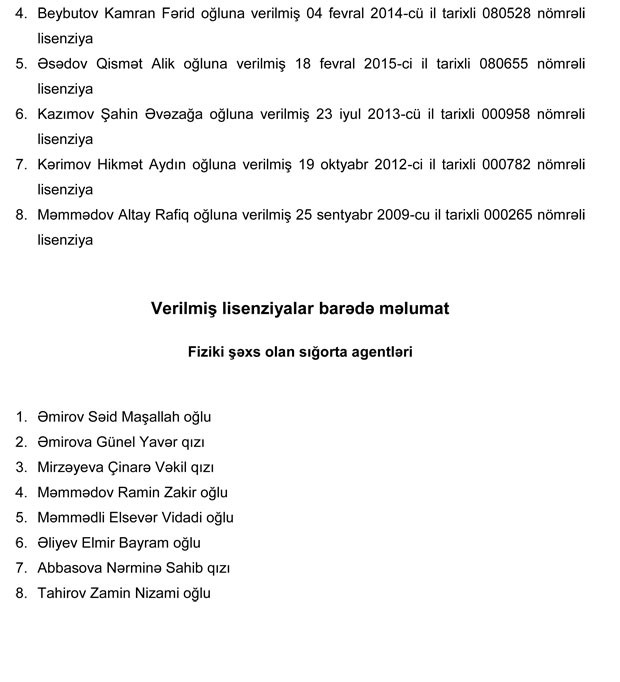 Maliyyə Bazarlarına Nəzarət Palatasının müvafiq qərarı ilə fəaliyyəti barədə rüblük hesabatları təqdim etməyən şəxslərin sığorta agenti fəaliyyətinə verilmiş lisenziyaları 3 (üç) ay müddətinə dayandırılmışdı. Həmin tarixdən etibarən lisenziyanın qüvvəsinin dayandırılmasına əsas verən halların aradan qaldırılmaması ilə əlaqədar 8 nəfər fiziki şəxsin sığorta agenti fəaliyyətinə verilmiş lisenziyaları ləğv edilib.