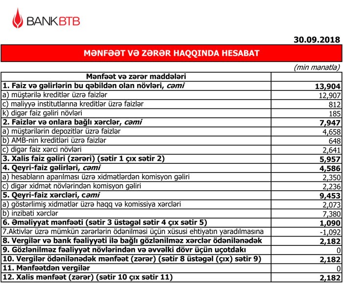 Müqayisə üçün qeyd edək ki, ötən ilin yanvar-sentyabr ayları ərzində “Bank BTB” nin cəmi gəlirlər 11 milyon 73 min manat (faiz gəlirləri 10 milyon 157 min manat, qeyri-faiz gəlirləri 916 min manat) xərcləri isə 15 milyon 806 min manat təşkil etmişdi. Nəticədə Bank, ötən ilin 9 ayını 4 milyon 733 min manat əməliyyat zərəri ilə başa vurmuşdu. Aktivlər üzrə mümkün zərərlərin ödənilməsi üçün xüsusi ehtiyatın 4 milyon 895 min manatı azad olduğundan əməliyyat zərəri bağlanmış və “Bank BTB” 162 min manat xalis mənfəət əldə etmişdi.