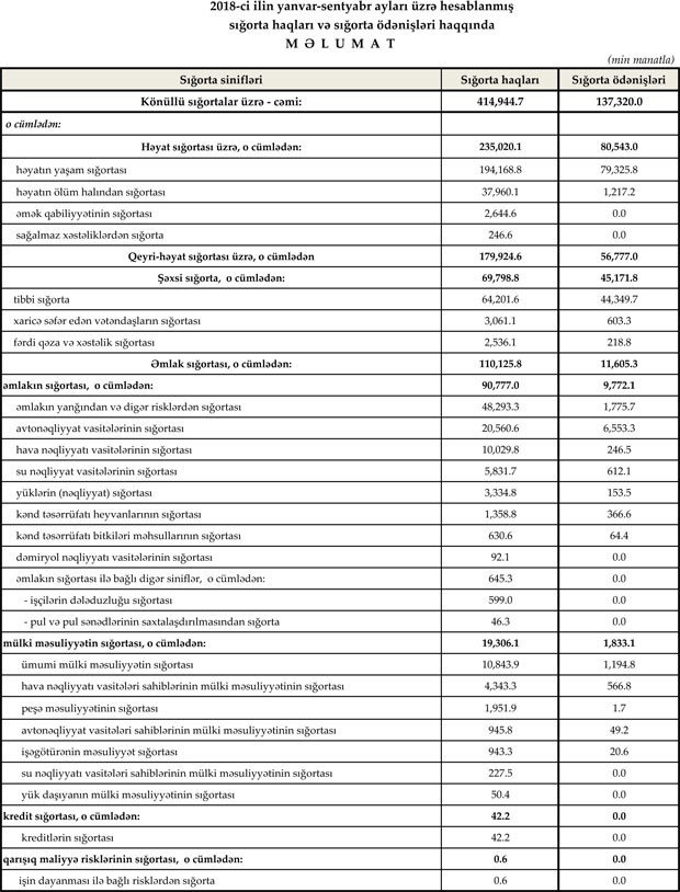 2018-ci ilin yanvar-sentyabr ayları ərzində ölkədə fəaliyyət göstərən 21 sığorta şirkəti tərəfindən 568 milyon 538 min manat məbləğində sığorta haqları toplanıb, 186 milyon 911 min manat məbləğində sığorta ödənişi həyata keçirilib.