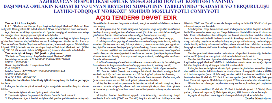 Tenderə əsasən, 30 ədəd NİVA avtomobili satın alınır. Tenderdə sözügedən avtomobilin satışı ilə məşğul olan şirkətlər iştirak edə bilərlər. İştirak haqqı 800 manatdır.