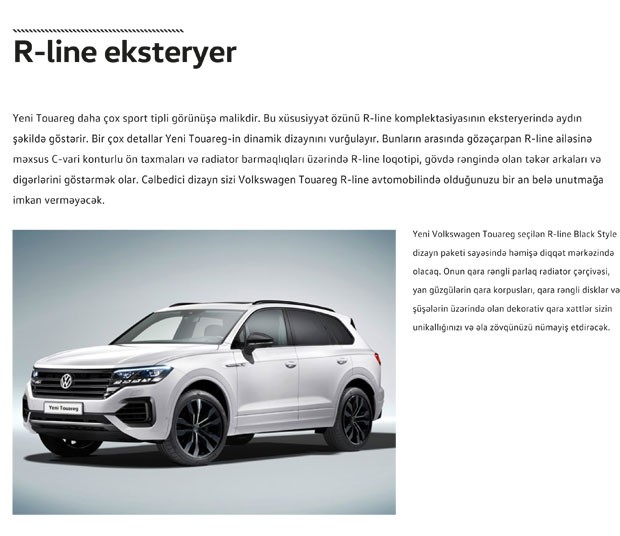 Yeni Volkwagen Touareg-in eksteryerinə baxdıqda həyacanlanmamaq mümkün deyil, çünki qarşınızda artıq premium seqmentə aid SUV var. Onu keçmiş nəsil Touareg ilə müqayisə etmək mümkün deyil, çünki Yeni Touareg tamamilə yeni görünüşə malikdir. R-line komplektasiyaya malik Yeni Touareg-də dəyişiklikləri saymaqla bitmir: 21 düyümlük yüngül lehimli disklər, sport görünüş verən xəttlər, ön buferin yan havaalma bölmələri və sairə.