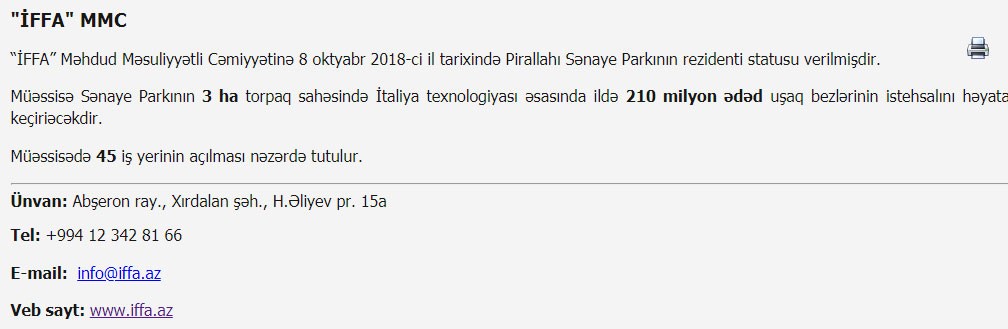 2019-cu ilin dördüncü rübündə "İFFA" şirkətinin yeni uşaq bezi istehsalı zavodu istifadəyə veriləcək. "Marja" xəbər verir ki, şirkət, oktyabrın 8-də Pirallahı Sənaye Parkının rezidenti statusunu alıb.