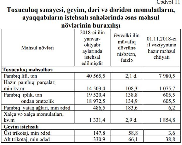 “Marja” Dövlət Statistika Komitəsinin aylıq hesabatına istinadən xəbər verir ki, 2018-ci ilin yanvar-oktyabr aylarında 1 331,4 kv.m xalça və xalça məmulatları istehsal edilib. Bu, əvvəlki ilin müvafiq dövrünə nisbətən 2.9 dəfə çoxdur.