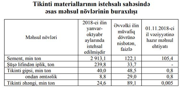 2018-ci ilin yanvar-oktyabr aylarında tikinti materiallarının istehsalı sahəsində fəaliyyət göstərən müəssisələr tərəfindən istehsal edilmiş məhsulun ümumi dəyəri əvvəlki ilin müvafiq dövrünə nisbətən 28,9 faiz artaraq 512,1 milyon manat təşkil etmişdir.