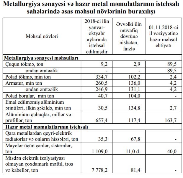 Metallurgiya sənayesi və hazır metal məmulatlarının istehsalı sahələrində yanvar-oktyabr aylarında 609,9 milyon manatlıq məhsul istehsal olunmuş, metallurgiya sənayesində 13,3 faiz artım, hazır metal məmulatlarının istehsalı sahəsində 1,2 faiz azalma müşahidə olunmuşdur.