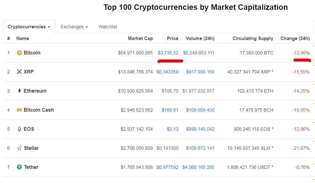 "Marja" xəbər verir ki, Bakı vaxtı ilə saat 13:20-yə olan məlumata görə, Bitcoin-in qiyməti 14% ucuzlaşma ilə 3735 dollar olub.