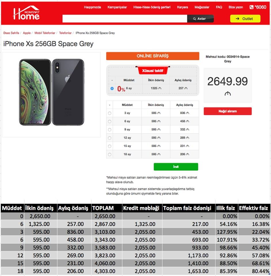 “Marja”nın məlumatına görə, “Kontakt Home” “iPhone Xs 256GB Space Grey” telefonunu nağd 2650 manat satır. Telefonu 3 ay müddətinə kreditlə alan zaman illik faiz dərəcəsi 128%-ə çıxır.