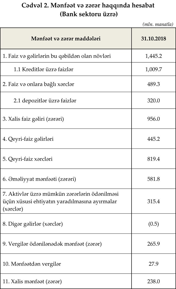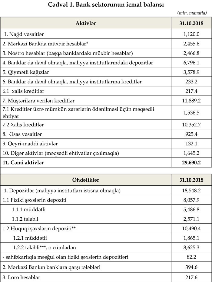 31 oktyabr 2018-ci il tarixinə Azərbaycanda fəaliyyət göstərən bankların cəmi aktivləri 29 milyard 690.2 milyon manat, kredit portfeli 11 milyard 889.2 milyon manat, cəmi öhdəlikləri isə 25 milyard 518.2 milyon manat təşkil edib.