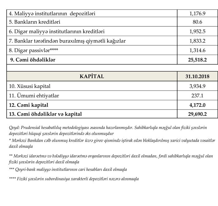 2018-ci ilin oktyabr ayı ərzində bank sektorunun aktivləri 1.7% (488.4 milyon manat), öhdəlikləri 1.7% (429.2 milyon manat), balans kapitalı isə 1.4% (59.2 milyon manat) artıb.