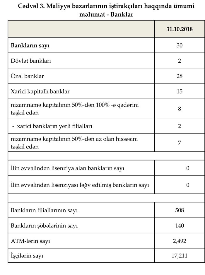 Fəaliyyət göstərən 30 bankın filiallarının sayı 508, şöbələrinin sayı 140, ATM-lərin sayı 2 492 olub. Bank sektorunun işçi heyəti oktyabr ayında 0.8% (145 nəfər) artaraq