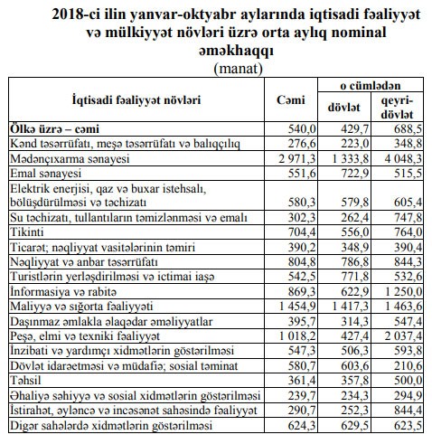2018-ci ilin yanvar-oktyabr aylarında ölkə iqtisadiyyatında muzdla çalışan işçilərin orta aylıq nominal əməkhaqqı 2017-ci ilin müvafiq dövrünə nisbətən 2,8 faiz artaraq 540 manat təşkil etmişdir.