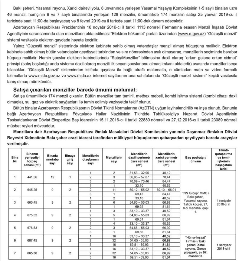 Bakı şəhəri, Yasamal rayonu, Xarici dairəvi yolu, 8 ünvanında yerləşən Yasamal Yaşayış Kompleksinin 1-5 saylı binaları üzrə 46 mənzil, həmçinin 6 və 7 saylı binalarında yerləşən 128 mənzilin, ümumilikdə 174 mənzilin satışı 25 yanvar 2019-cu il tarixində saat 11:00-da başlayacaq və 8 fevral 2019-cu il tarixi saat 11:00-dək davam edəcəkdir.