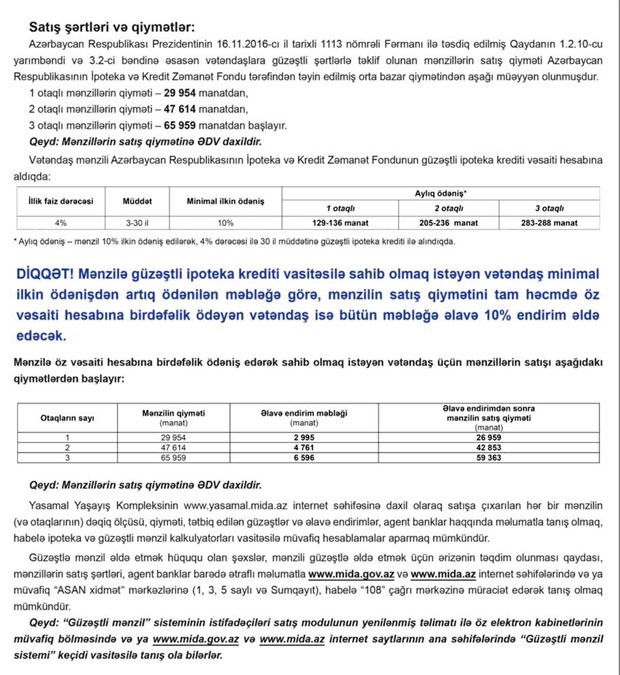 DİQQƏT! Mənzilə güzəştli ipoteka krediti vasitəsilə sahib olmaq istəyən vətəndaş minimal ilkin ödənişdən artıq ödənilən məbləğə görə, mənzilin satış qiymətini tam həcmdə öz vəsaiti hesabına birdəfəlik ödəyən vətəndaş isə bütün məbləğə əlavə 10% endirim əldə edəcək.