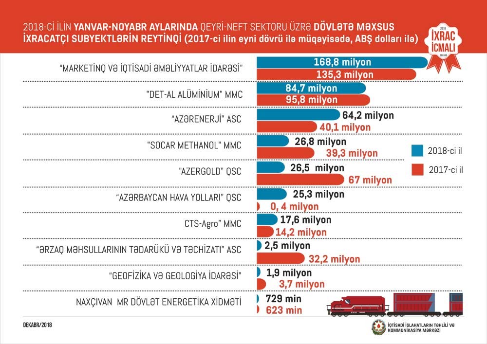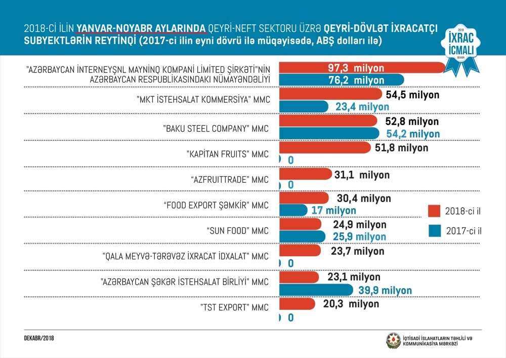 “İxrac İcmalı”nın dekabr sayında qeyri-neft sektoru üzrə əsas ixracatçı subyektlərin reytinqi də verilib. 2018-ci ilin yanvar-noyabr aylarında qeyri-neft sektoru üzrə qeyri-dövlət ixracatçı şirkətlərin siyahısında ilk onluqda “Azərbaycan İnterneyşnl Mayninq Kompani Limited Şirkəti”nin Azərbaycan Respublikasındakı nümayəndəliyi, "MKT İstehsalat Kommersiya" MMC, "Baku Steel Company" MMC, "Kapitan Fruits" MMC, “Azfruittrade” MMC, “Food Export Şəmkir” MMC, “Sun Food” MMC, "Qala meyvə-tərəvəz ixracat idxalat" MMC, "Azərbaycan Şəkər İstehsalat Birliyi" MMC, "TST Export" MMC təmsil olunub.