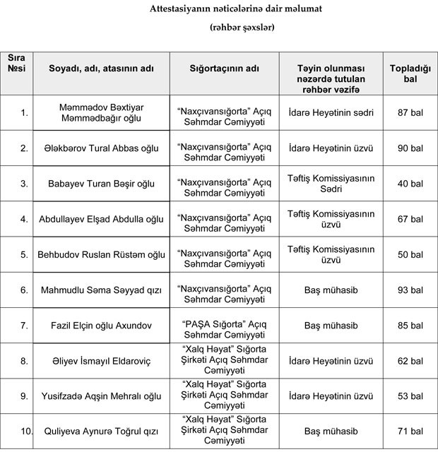 Attestasiyadan keçənlərdən biri Məmmədov Bəxtiyar Məmmədbağır oğludur. O, “Naxçıvansığorta” ASC-də İdarə Heyətinin sədri təyin ediləcək. (Daha ətraflı aşağıdakı cədvəldə)