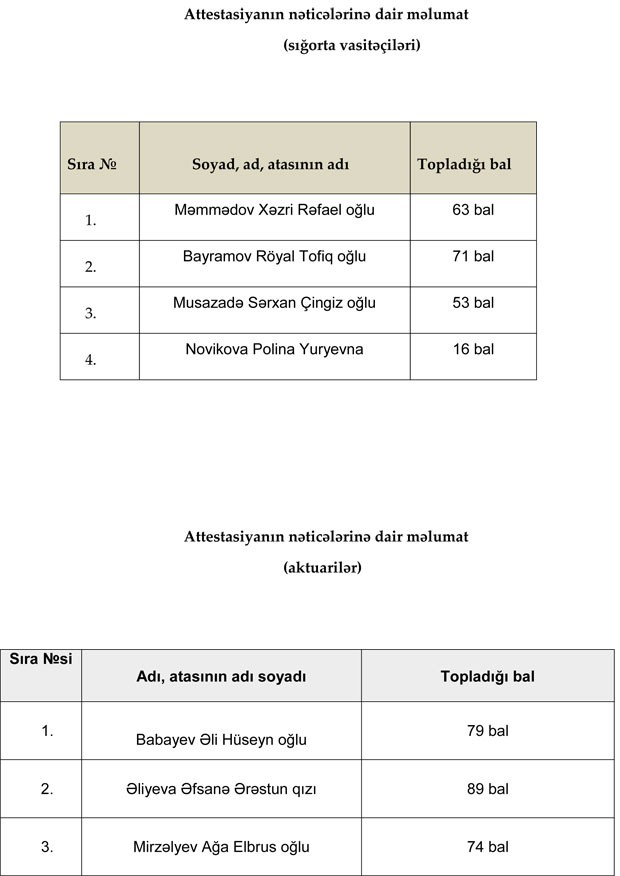 Qeyd edək ki, “Sığortaçıların rəhbər işçisi vəzifələrinə namizədlər müvafiq sığorta vasitəçiliyi üzrə fəaliyyətə lisenziya, həmçinin aktuari fəaliyyətinə aktuari şəhadətnaməsi almaq istəyən fiziki şəxslər üçün attestasiyanın təşkili və keçirilməsi” Qaydalarının 5.6-cı bəndinə əsasən attestasiyada iştirak edən şəxs 70 test tapşırığına düzgün cavab verdikdə attestasiyadan keçmiş hesab olunur.