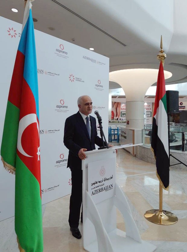 Tədbirdə çıxış edən İqtisadiyyat naziri Şahin Mustafayev BƏƏ-də Azərbaycan Ticarət Evinin açılmasının dövlət başçılarının ölkələrimiz arasında iqtisadi-ticarət əlaqələrinin inkişafına verdikləri böyük önəmin, BƏƏ-də Azərbaycan məhsullarına olan marağın göstəricisi olduğunu vurğulayıb. Qeyd olunub ki, qarşılıqlı hörmət və dostluq prinsiplərinə əsaslanan Azərbaycan-BƏƏ əlaqələri uğurla inkişaf edir. Nazir qeyd edib ki, Azərbaycanın xarici ölkələr üzrə ilk ticarət nümayəndələrindən biri də məhz Birləşmiş Ərəb Əmirliklərinə təyin edilib, 2017-ci və 2018-ci illərdə Dubay, Əbu-Dabi və Şarja şəhərlərinə ixrac missiyaları təşkil olunub.