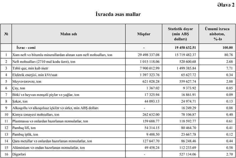 2018-ci ildə Azərbaycandan 15 milyard 719 milyon 482 min dollar dəyərində 29 milyon 498 min 337 ton xam neft və bitumlu minerallardan alınan xam neft məhsulları ixrac edilib.