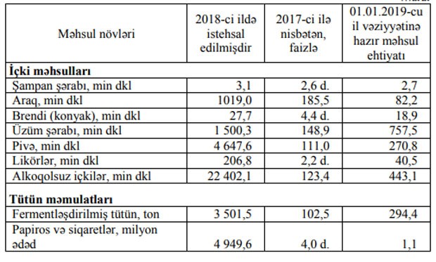 2017-ci illə müqayisədə ötən il tütün məmulatlarının istehsalında 2,7 dəfə, içki istehsalında 12,2 faiz artım müşahidə olunmuşdur.