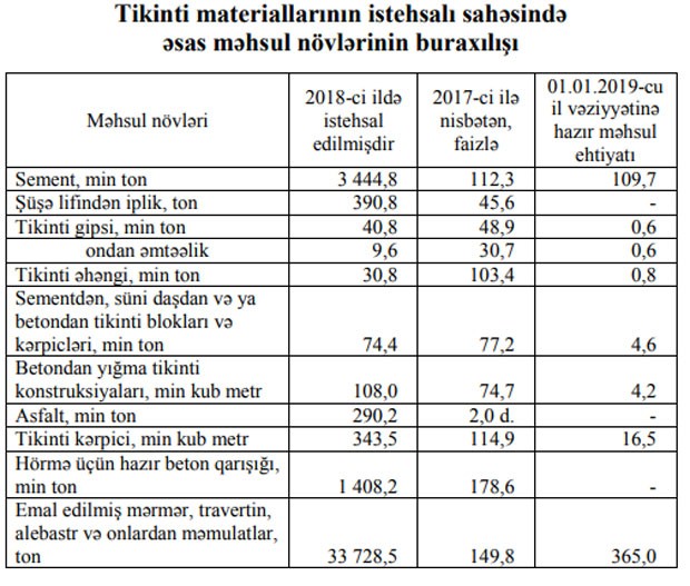 Marja” Dövlət Statistika Komitəsinin aylıq hesabatına istinadən xəbər verir ki, hörmə üçün hazır beton qarışığının istehsalı 78,6 faiz, tikinti kərpicinin istehsalı 14,9 faiz, sementin istehsalı 12,3 faiz, tikinti əhənginin istehsalı 3,4 faiz artmış, betondan yığma tikinti konstruksiyalarının istehsalı 25,3 faiz, tikinti gipsinin istehsalı 51,1 faiz azalmışdır.