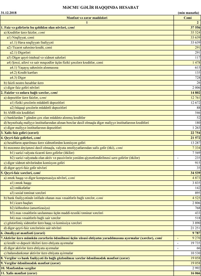 2017-ci ildə Bankın cəmi gəlirləri 46 milyon 416 min manat, o cümlədən faiz gəlirləri 27 milyon 804 min manat, qeyri-faiz gəlirləri 18 milyon 612 min manat təşkil etmişdi. Faiz və qeyri-faiz xərcləri çıxıldıqdan sonra bankın 9 milyon 355 min manat əməliyyat mənfəəti qalmışdı. Bank əməliyyat mənfəətinin 7 milyon 214 min manatını aktivlər üzrə mümkün zərərlərin ödənilməsi üçün xüsusi ehtiyatın yaradılmasına ayırmış və 540.45 min manat mənfəət vergisi ödəmişdi. Nəticədə Bank həmin ili 1 milyon 600 min manat xalis mənfəət ilə bağlamışdı.