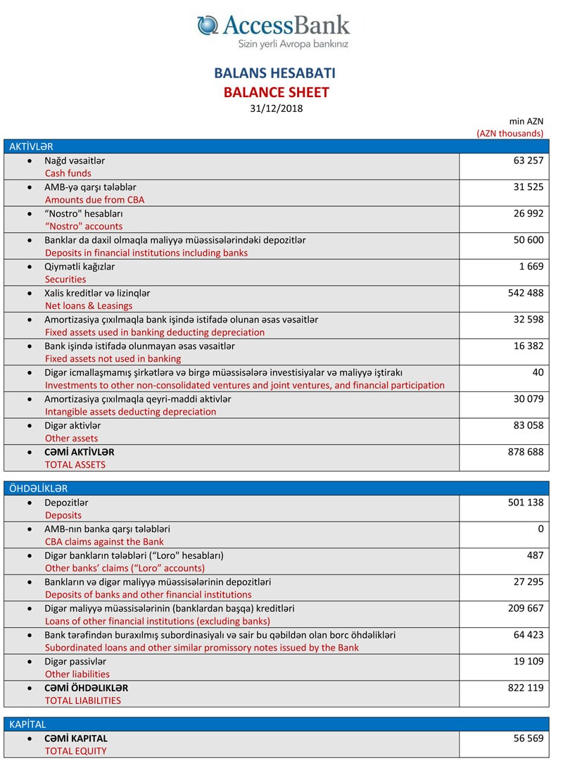 31 Dekabr 2018-ci il tarixində “AccessBank” 878 milyon 688 min manat cəmi aktivlərə, 822 milyon 119 min manat cəmi öhdəliklərə və 56 milyon 569 min manat cəmi balans kapitalına malik olub. Bank 2017-ci ilin sonunda 844 milyon 821 min manat cəmi aktivlərə, 775 milyon 958 min manat cəmi öhdəliklərə və 68 milyon 863 min manat cəmi balans kapitalına malik idi.