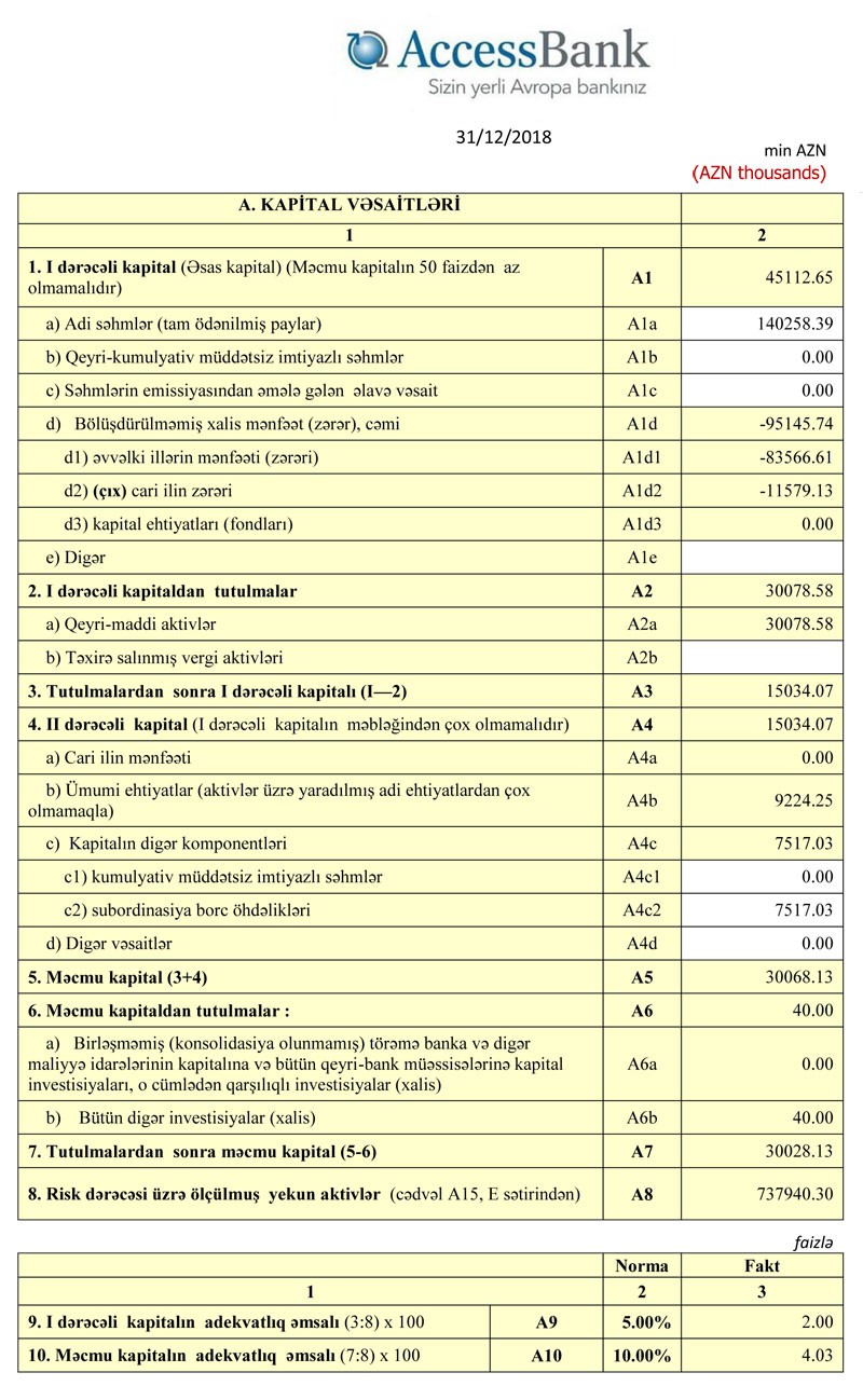 31 Dekabr 2018-ci il tarixində “AccessBank” 30 milyon 28 min manat məcmu kapitala malik olub.