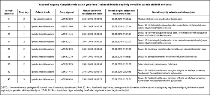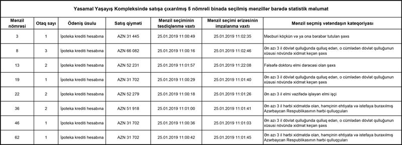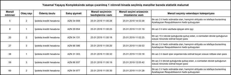 Statistik məlumatlardan məlum olur ki, ən çox mənzil hərbi qulluqçular tərəgindən seçilib.
