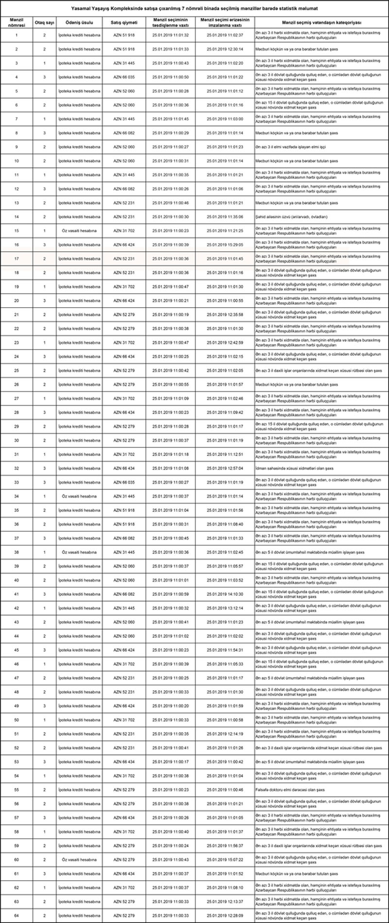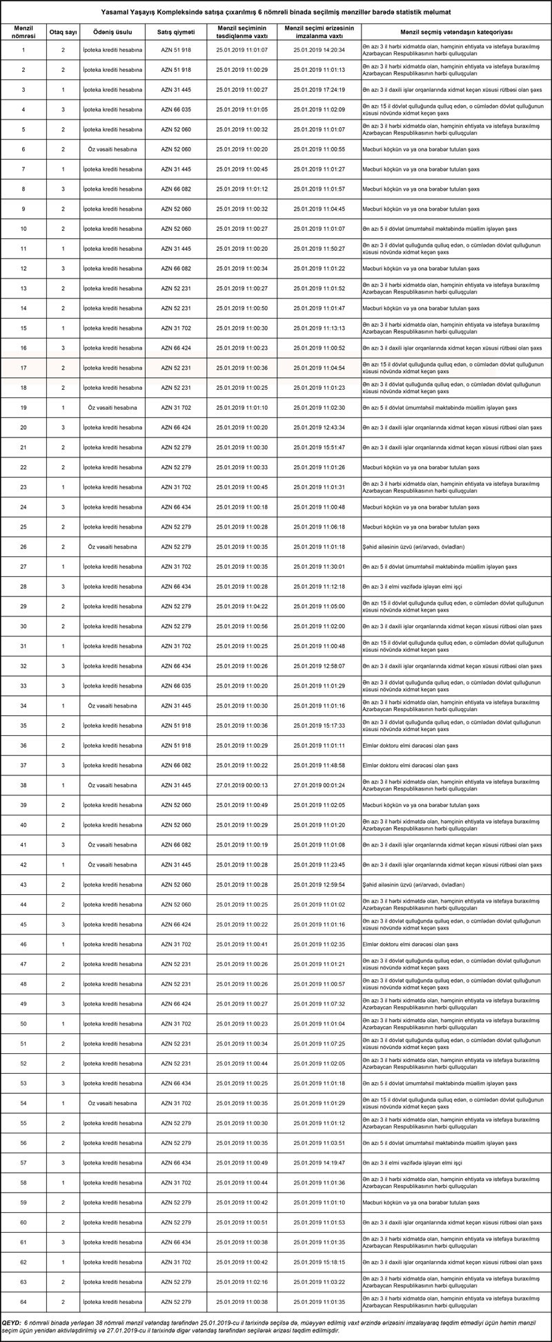 Yasamal Yaşayış Kompleksinin 1-5 saylı binaları üzrə 46 mənzil, həmçinin 6 və 7 saylı binalarında yerləşən 128 mənzilin, ümumilikdə 174 mənzilin seçimi 25.01.2019-cu il tarixində başa çatdırılmışdır.