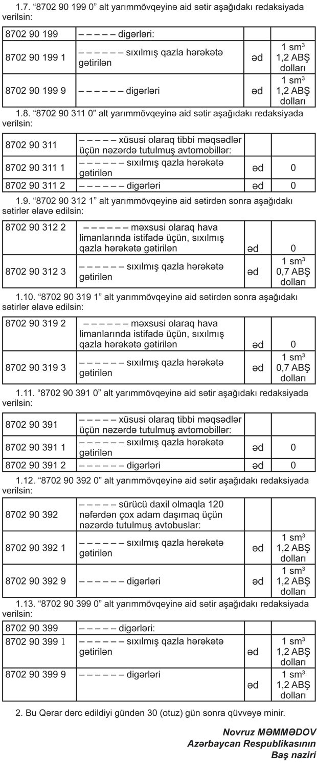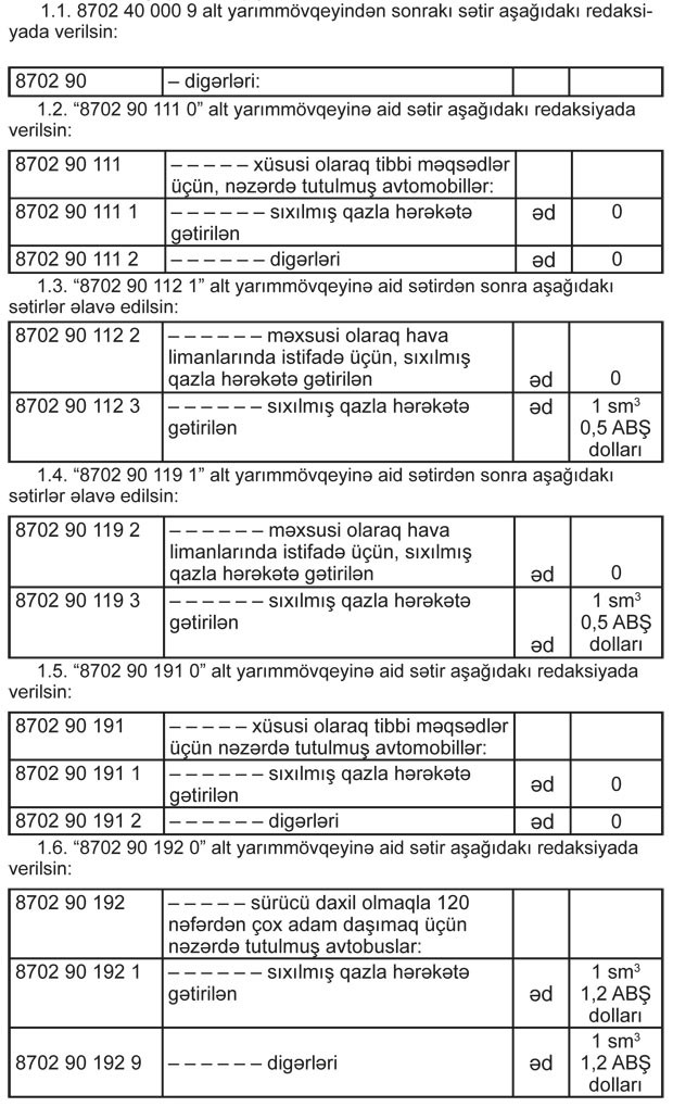 Dəyişikliyə görə, sıxılmış qazla hərəkətə gətirilən avtobusların idxalı zamanı mühərrikinin 1 sm3-ə görə modeldən asılı olaraq 0.5 - 1,2 ABŞ dolları gömrük rüsumu ödəniləcəkdir.