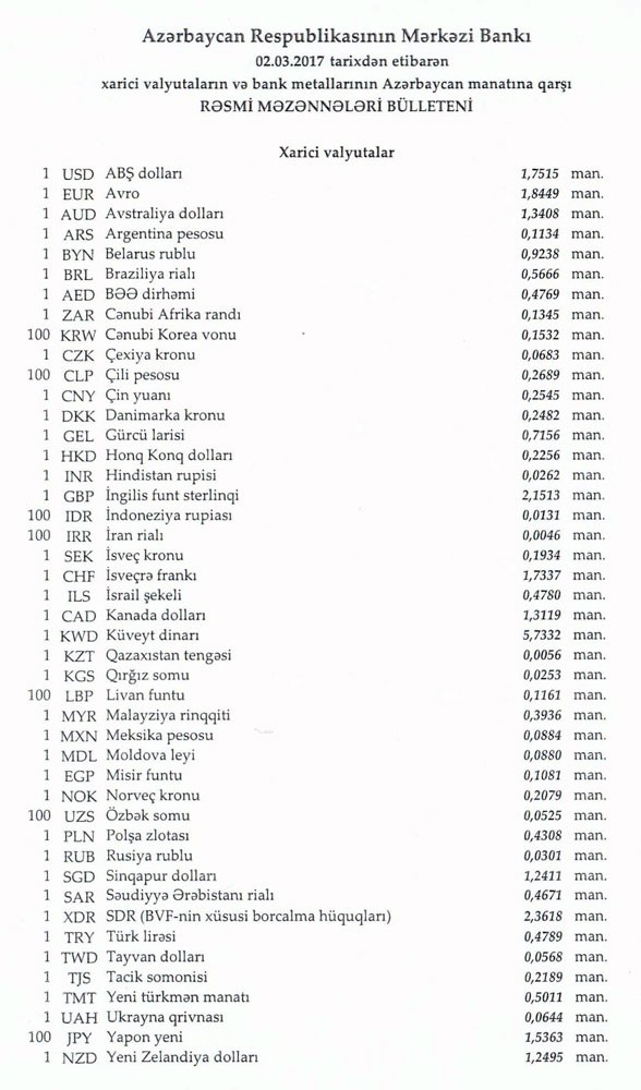 Martın 2-nə Mərkəzi Bankın açıqladığı rəsmi Dollar/manat məzənnəsi Martın 1-i ilə müqayisədə dəyişməyərək 1,7515 manat olub, Avro/manat məzənnəsi isə 1.8449 manata düşüb.