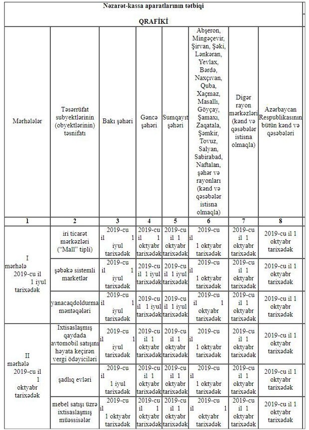 Bu məsələ Nazirlər Kabinetinin təsdiqlədiyi “Nəzarət-kassa aparatlarının tətbiqi Qrafiki”ndə öz əksini tapıb.