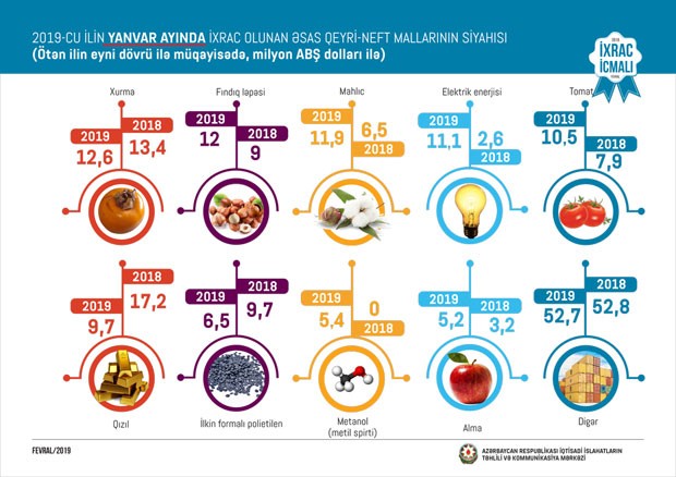 2018-ci ilin müvafiq dövrü ilə müqayisədə 2019-cu ilin yanvar ayı ərzində Rusiyaya qeyri-neft ixracı 26%, Türkiyəyə 9%, Gürcüstana 20%, İrana 4,1 dəfə artıb.