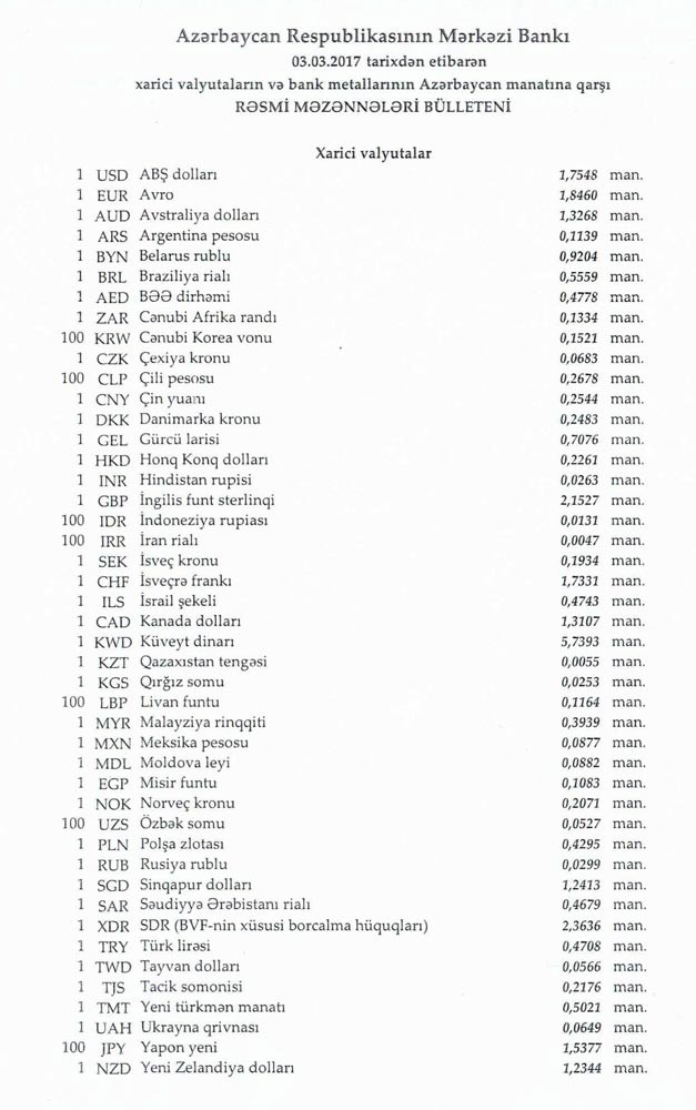 Martın 3-nə Mərkəzi Bankın açıqladığı rəsmi Dollar/manat məzənnəsi Martın 2-i ilə müqayisədə qalxaraq 1,7548 manat olub, Avro/manat məzənnəsi isə 1.8460 manata yüksəlib.