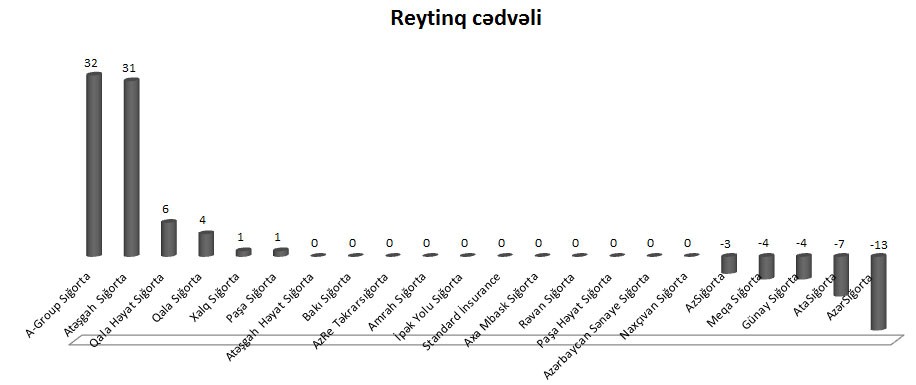Cədvəldə 6-11 yerləri bölüşən “Atəşgah Həyat Sığorta”, “Bakı Sığorta”, “AzRe Təkrarsığorta”, “Amrah Sığorta”, “İpək yolu Sığorta”, Standard İnsurance”, “Axa Mbask Sığorta”, “Rəvan Sığorta”, “Paşa Həyat Sığorta”, “Azərbaycan Sənaye Sığorta” və “Naxçıvan Sığorta” şirkətləri ya hər hansı rəy bildirilməməsi və ya bildirilmiş rəylərin öz təsdiqini tapmaması nəticəsində 0 bal toplamış və nəticədə cədvəlin 6-11 yerlərini formalaşdırmışlar.