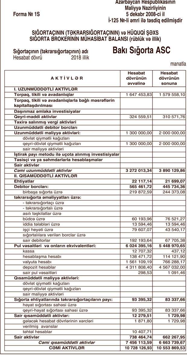 31 Dekabr 2018-ci il tarixində “Bakı Sığorta” ASC 10 milyon 553 min manat cəmi aktivlərə, 1 milyon 276 min manat cəmi öhdəliklərə və 9 milyon 278 min manat cəmi kapitala malik olub.