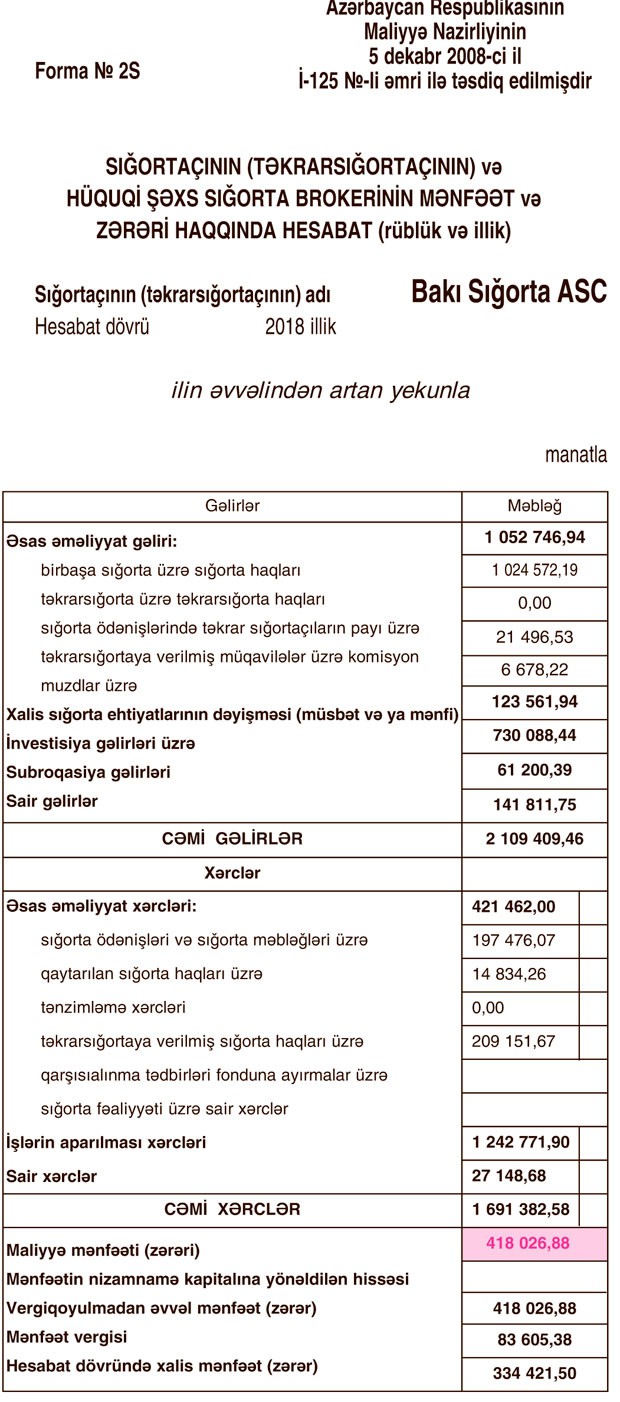“Marja” Şirkətin maliyyə hesabatlarına istinadən xəbər verir ki, 2018-ci ildə “Bakı Sığorta”nın cəmi gəlirləri 2 milyon 109 min 409 manat, cəmi xərcləri 1 milyon 691 min 382 manat, əməliyyat mənfəəti (maliyyə mənfəəti) 418 min 26 manat təşkil edib. Şirkət ötən il 83 min 605 manat mənfəət vergisi ödəyib.