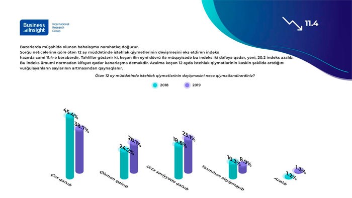 Bazarlarda müşahidə olunan bahalaşma narahatlıq doğurur. Sorğu nəticələrinə görə ötən 12 ay müddətində istehlak qiymətlərinin dəyişməsini əks etdirən indeks hazırda cəmi 11.4-ə bərabərdir.
