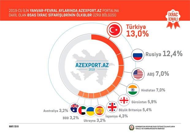 2019-cu ilin yanvar-fevral ayları ərzində portala daxil olan ixrac sifarişlərinin ilk beşliyində isə Türkiyə (13%), Rusiya(12,4%), ABŞ (7%), Hindistan (7%) və Gürcüstan (5,9%) qərarlaşıb.