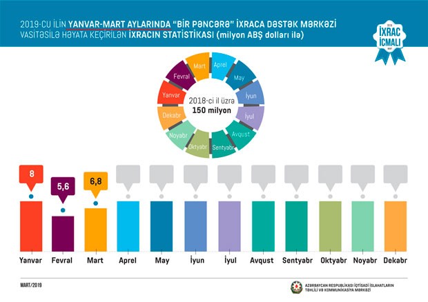 Həmçinin “İxrac İcmalı”nda göstərilib ki, cari ilin mart ayında “Bir Pəncərə” İxraca Dəstək Mərkəzi vasitəsi ilə həyata keçirilən qeyri-neft ixracının dəyəri isə 6,8 milyon ABŞ dolları olub. 2019-cu ilin yanvar-mart ayları ərzində “Bir Pəncərə” İxraca Dəstək Mərkəzi tərəfindən sahibkarlara ixracla bağlı müvafiq sertifikatlar verilib və bunun nəticəsində 20,1 milyon ABŞ dolları dəyərində qeyri-neft ixracı həyata keçirilib.