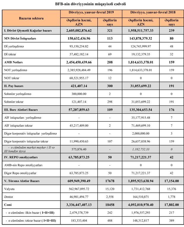 2019-cu il yanvar-fevral ayları ərzində Bakı Fond Birjasında bütün alətlər üzrə keçirilən əqdlərin ümumi həcmi 3 milyard 336 milyon 447 min manat təşkil etmişdir.