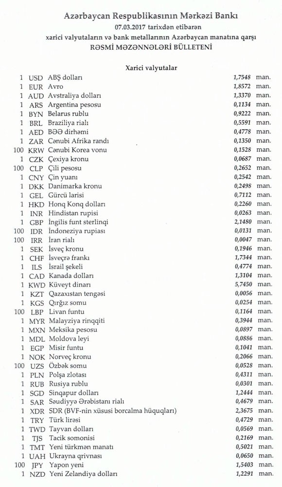 Martın 7-nə Mərkəzi Bankın açıqladığı rəsmi Dollar/manat məzənnəsi Martın 6-sı ilə müqayisədə dəyişməyərək 1,7548 manat olub, Avro/manat məzənnəsi isə 1.8572 manata düşüb.