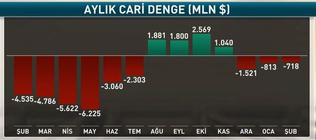Fevral aynda Türkiyənin cari əməliyyatlar kəsiri 718 milyon dollar, 12 aylıq cari kəsir isə 17 milyard 44 milyon dollar təşkil edib.