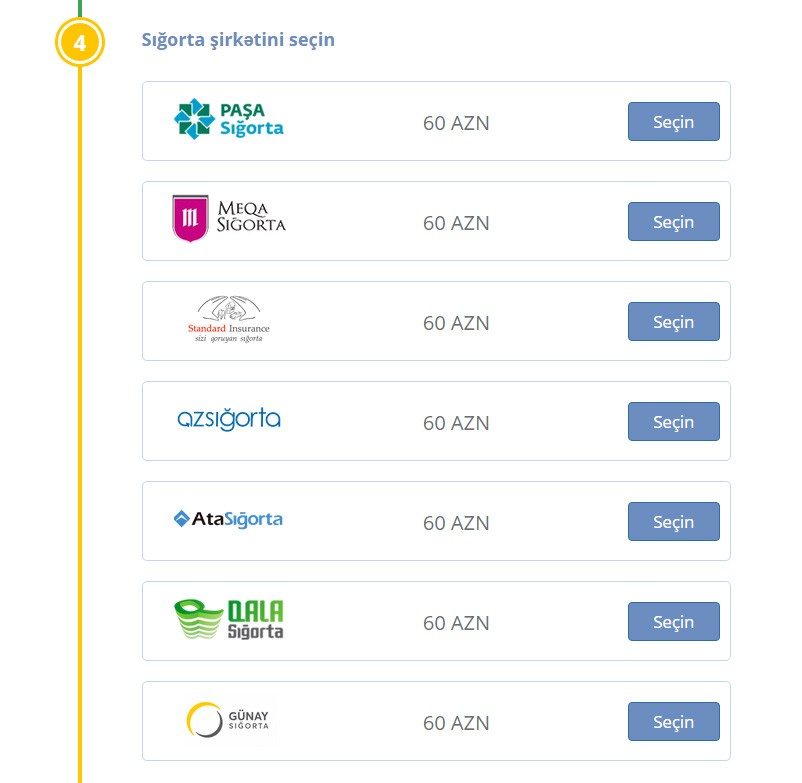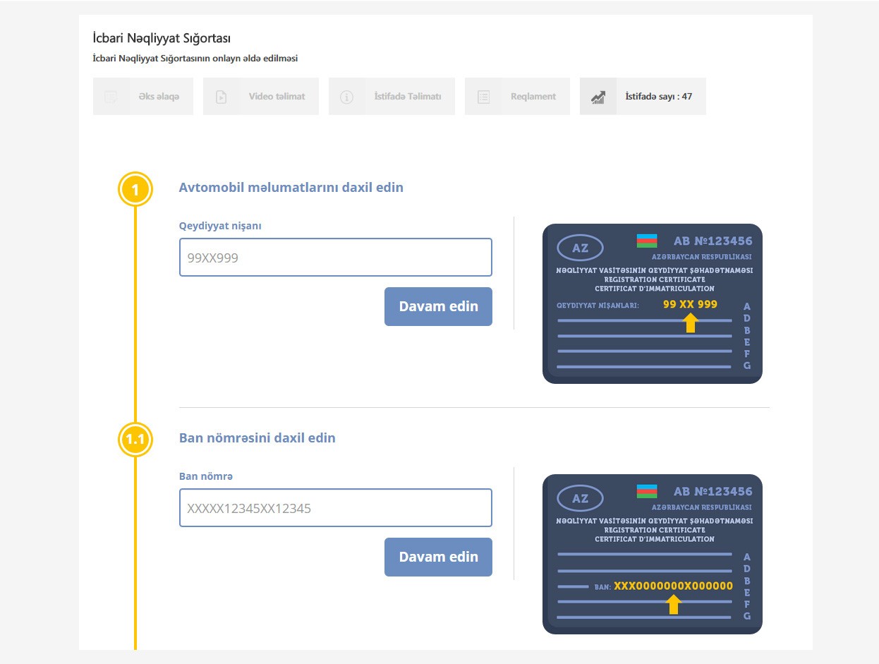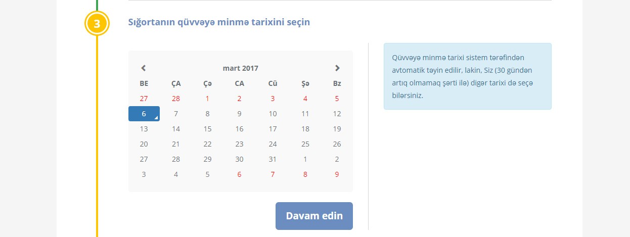 Ban nömrəsi daxil edildikdən sonra ekranda avtomobilin markası və modeli görünür. Bundan sonra vətəndaş şəxsi məlumatlarını sistemə daxil edib, “Davam et” düyməsini seçir. Sonra sığortanın qüvvəyə minmə tarixi müəyyənləşdirilir. Əslində, sığortanın qüvvəyə minmə tarixi sistem tərəfindən avtomatik təyin edilir, lakin vətəndaş 30 gündən artıq olmamaq şərti ilə digər tarixi də seçə bilər. Açılan səhifədə sığorta şirkətlərinin adları və ödəniləcək məbləğ görünür.