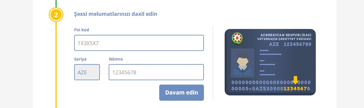 Açılan pəncərədə nəqliyyat vasitəsinin qeydiyyat nişanını daxil edib, “Davam et” düyməsini sıxdıqdan sonra avtomobilin ban nömrəsini qeyd etmək tələb olunur.
