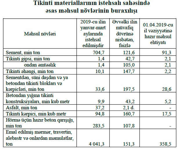 2019-cu ilin 1-ci rübündə tikinti materiallarının istehsalı sahəsində fəaliyyət göstərən müəssisələr tərəfindən istehsal edilmiş məhsulun ümumi dəyəri 8,5 faiz artaraq 121,3 milyon manat təşkil etmişdir.