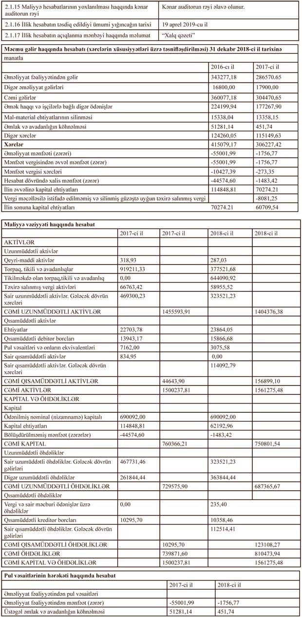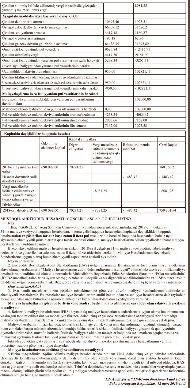 “Gənclik” ASC-nin 2018-ci il dekabrın 31-nə illik hesabatı