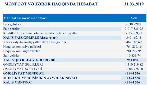 “Marja” Bankın maliyyə hesabatlarına istinadən xəbər verir ki, 2019-cu ilin yanvar-mart dövründə “Amrahbank”ın cəmi gəlirləri 4 milyon 273 min manat, cəmi xərcləri isə 6 milyon 303 min manat təşkil edib. Xərclər gəlirləri üstələdiyindən 2 milyon 30 min manat zərər yaranıb. Kreditlər üzrə ehtimal olunan zərərlər üçün ehtiyatdan 335 min manat azad olduğundan zərər 1 milyon 694 min manata düşüb.